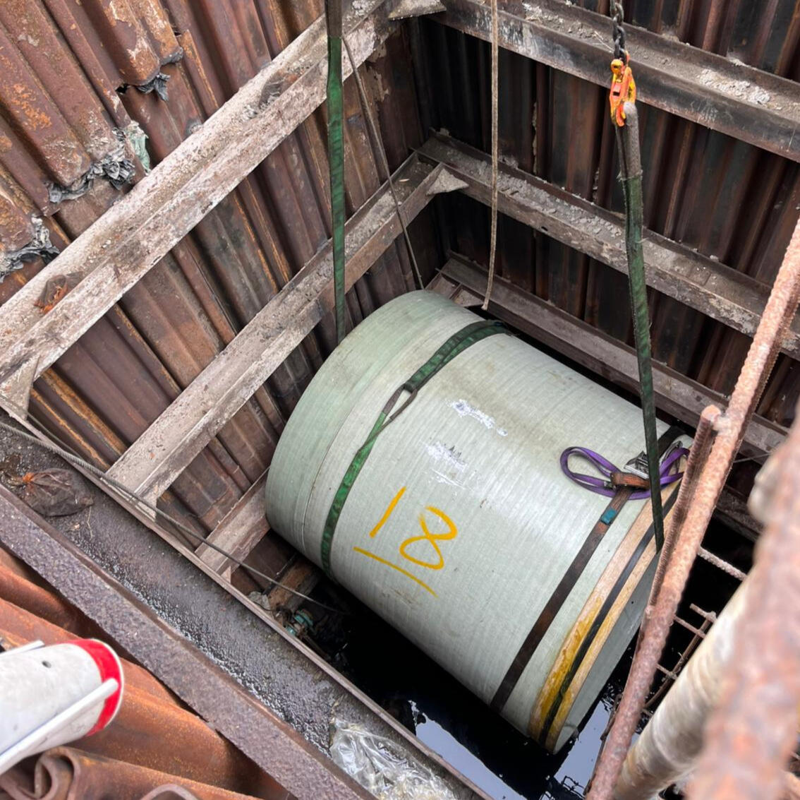 以推筒的形式,維修直徑較大的管道。此方法需要在管道路徑的其中一個位置挖坑以作推筒,工作人員將比原筒直徑稍短的強化玻璃纖維管(GRP),利用油壓的方式推進筒中,直至全段管道中都有強化玻璃纖維管後,再將漿水灌在原筒及GRP筒中間的位置,以固定新筒。灌漿完成後,則可還原挖坑。此方法適合在無法截流改道的管道。