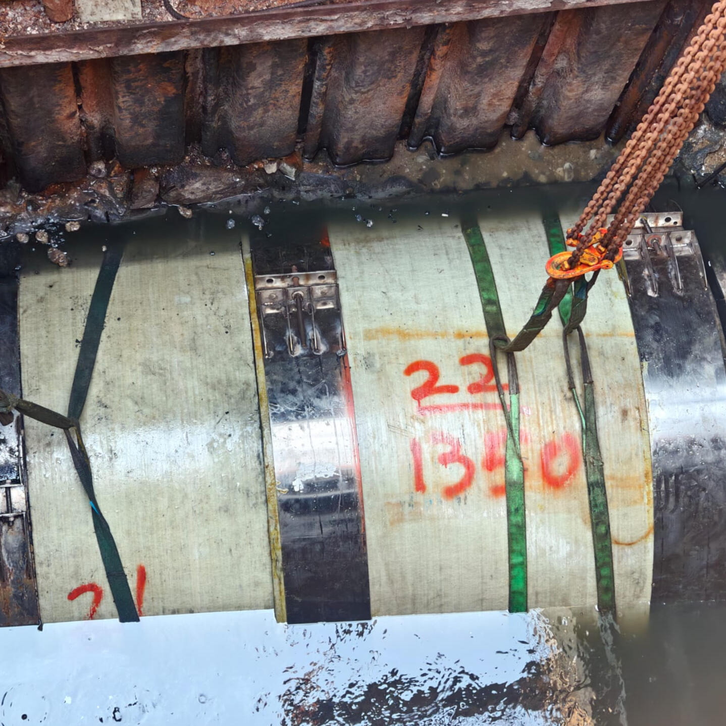 以推筒的形式,維修直徑較大的管道。此方法需要在管道路徑的其中一個位置挖坑以作推筒,工作人員將比原筒直徑稍短的強化玻璃纖維管(GRP),利用油壓的方式推進筒中,直至全段管道中都有強化玻璃纖維管後,再將漿水灌在原筒及GRP筒中間的位置,以固定新筒。灌漿完成後,則可還原挖坑。此方法適合在無法截流改道的管道。